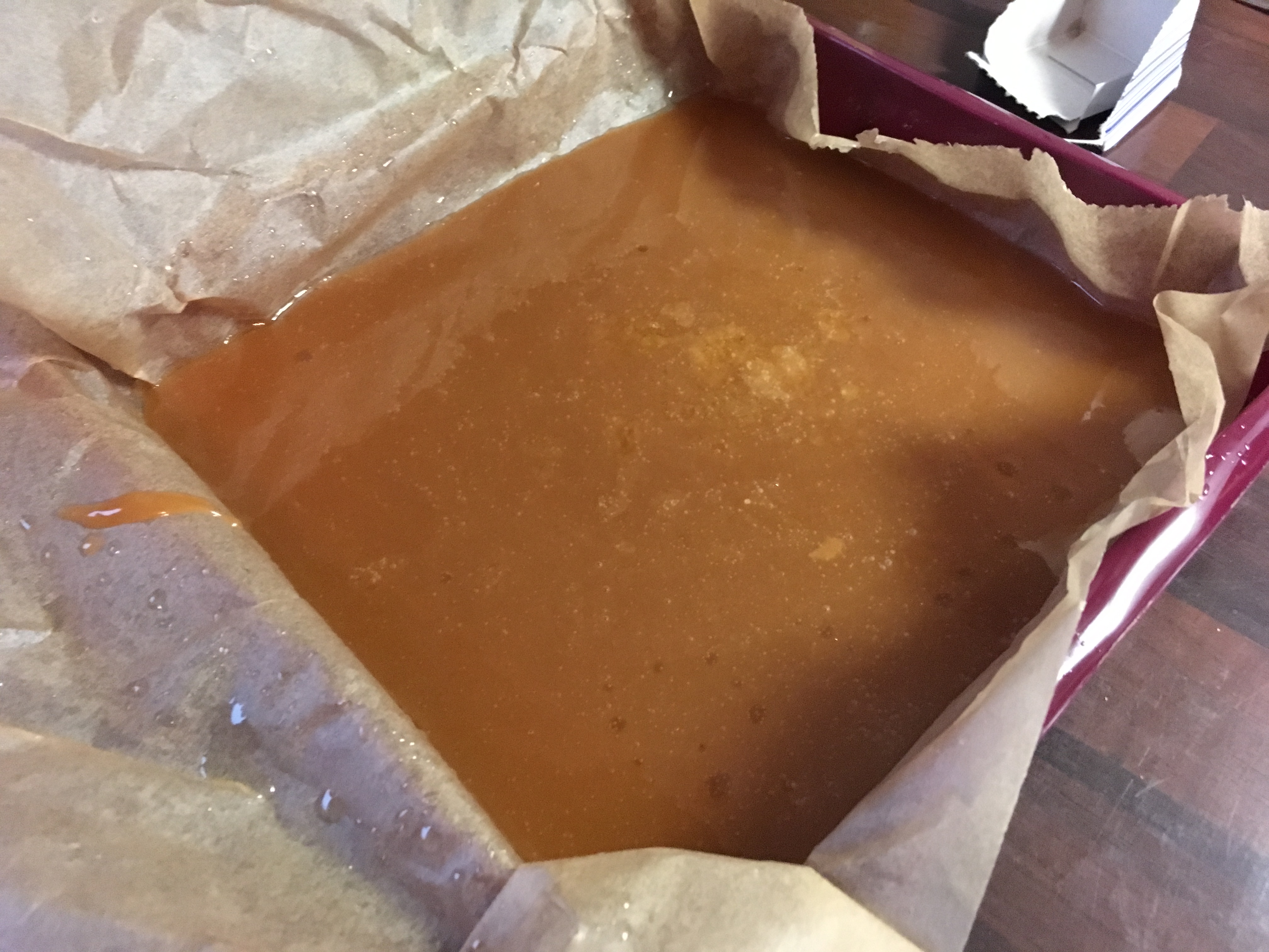 - Mit Erreichen der Temperatur die Karamellmasse vom Herd nehmen und sofort in die vorbereitete Kastenform gießen. Die Form ein paarmal auf der Arbeitsplatte »auftippen« lassen, damit eventuelle Luftblasen aus der Masse entweichen können, und für mindestens 3 ½-4 Stunden bei Raumtemperatur stehen lassen.