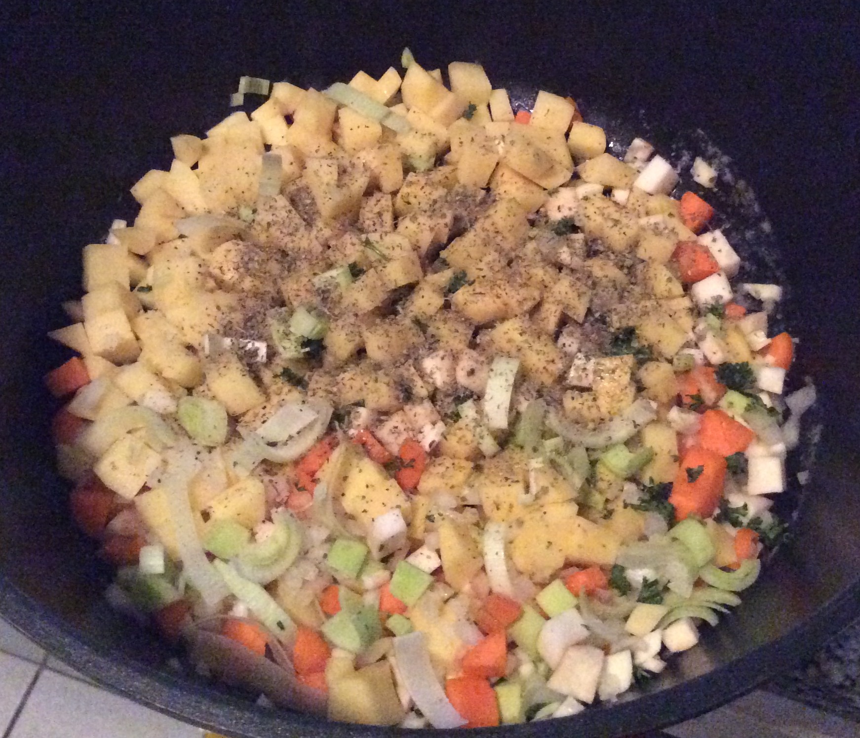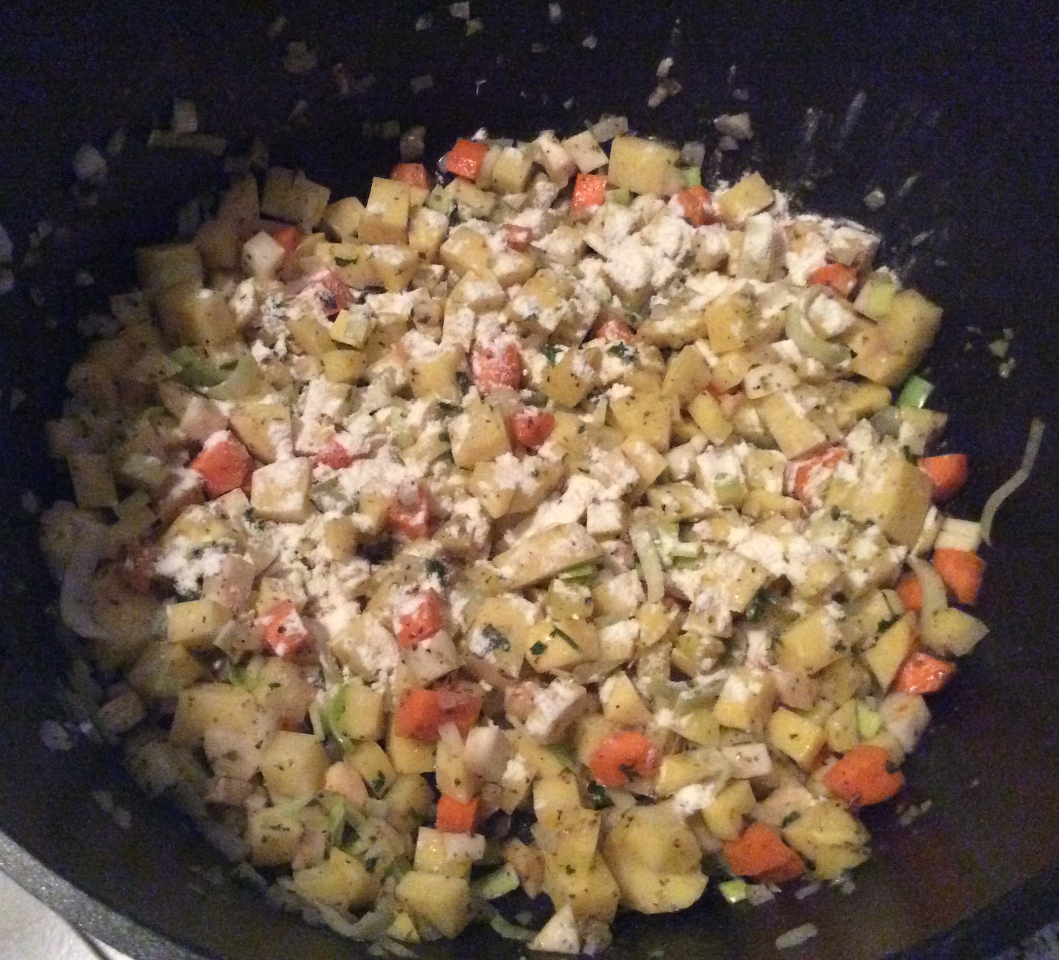 3. Erdäpfel, Zwiebel, Wurzelwerk und Knoblauch kurz in Butter anschwitzen, mit Majoran, Kümmel, Salz und Pfeffer würzen. Mit Mehl bestäuben und kurz weiterrösten.