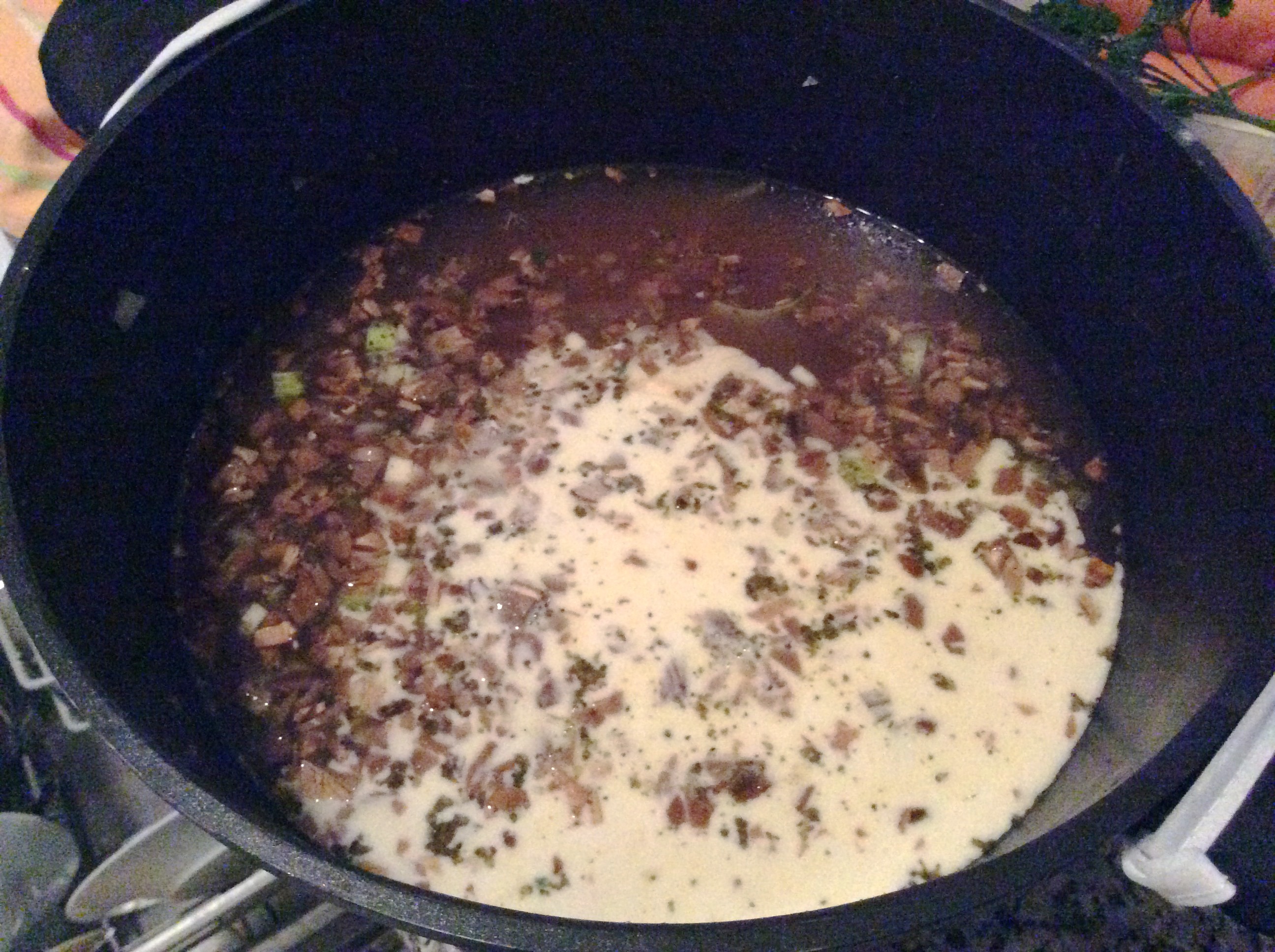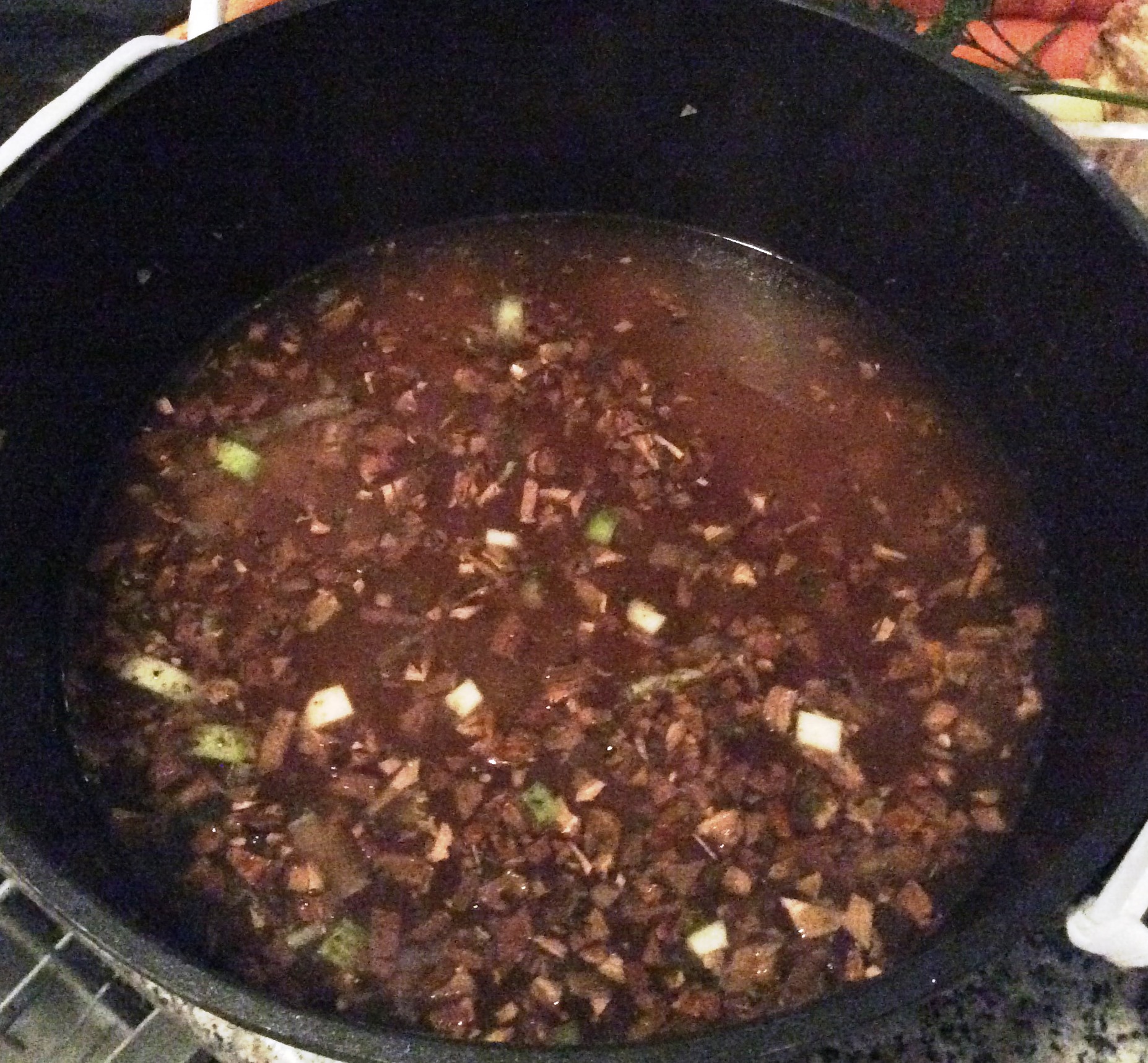 4. Mit der Gemüsesuppe übergießen, Steinpilze und das Einweichwasser dazu.