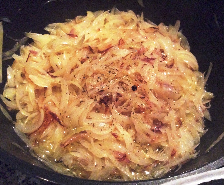 - In einem großen Topf Schmalz erhitzen und die Zwiebeln darin unter wiederholtem Rühren langsam goldgelb rösten.