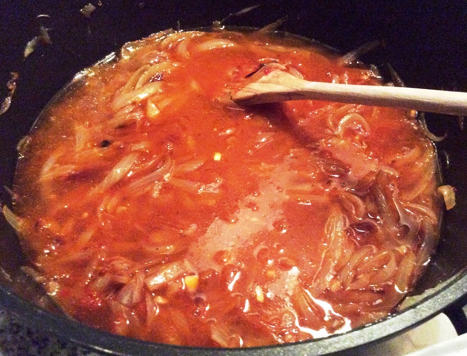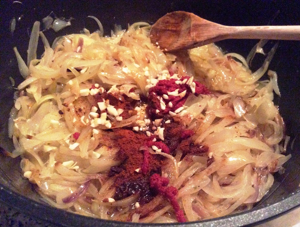 Paprikapulver, Tomatenmark, Knoblauch zugeben Essig, Wasser ablöschen - Aufkochen lassen, dann Fleischwürfel zugeben und ca. 2,5 Stunden weich dünsten. Währenddessen wiederholt umrühren und – wenn nötig – Wasser nachgießen.