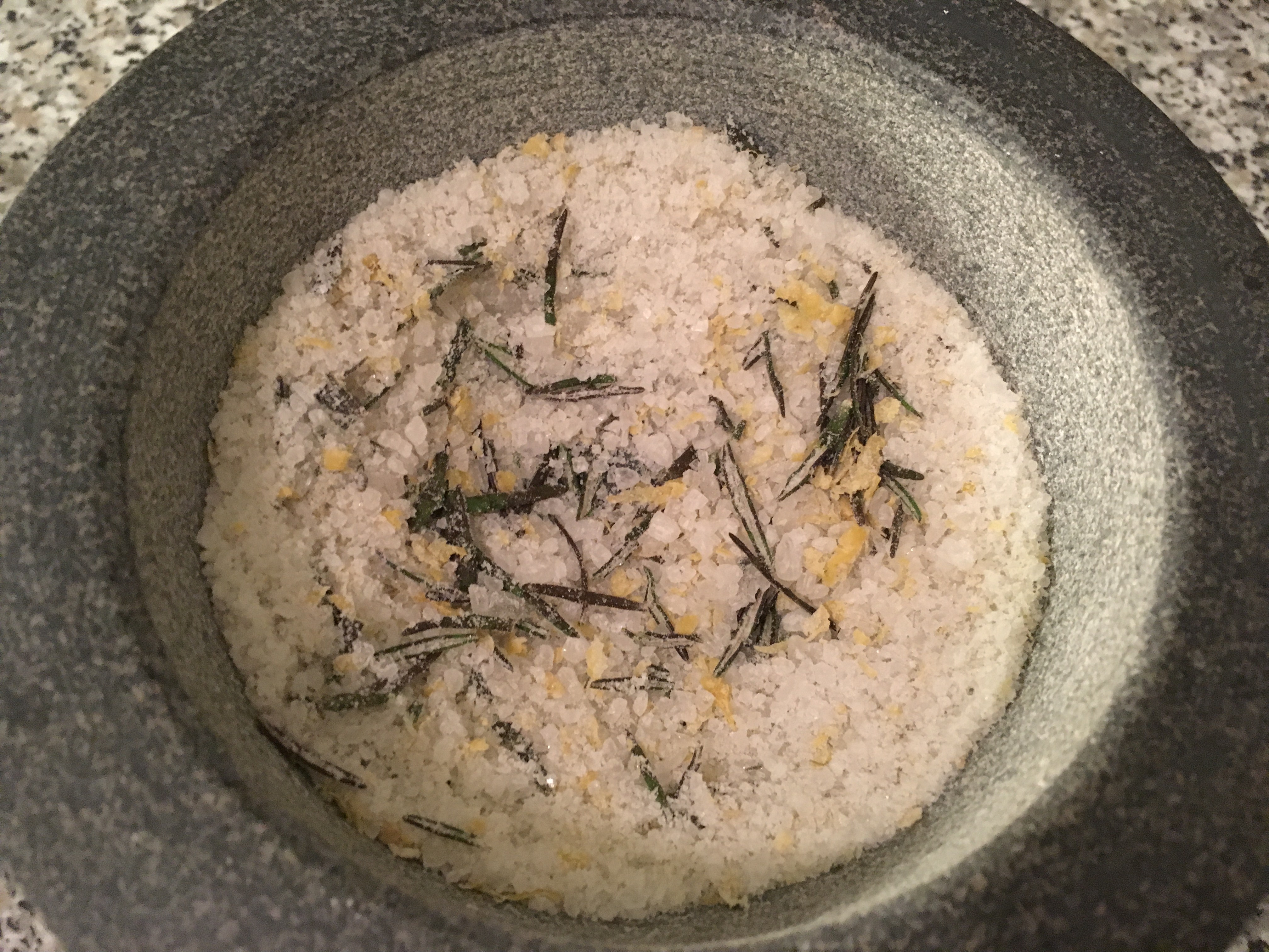 Zitronenabrieb zufügen Salz zufügen - Alles durchmengen und so lange mörsern, bis Sie eine feine Körnung bekommen.